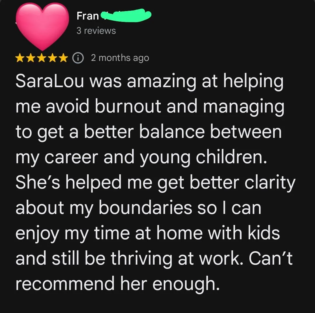 Hey there, lovely. I’m SaraLou, a specialist women’s coach, GP, yoga teacher, mum, and all-around cheerleader and nurturer of women’s mindsets and wellbeing.